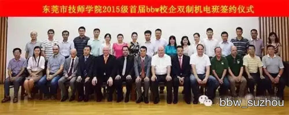 9月1日,在东莞市技师学院职教城校区隆重举行2015级首届bbw校企双制机电班的签约仪式。bbw职业教育集团与合作伙伴东莞市技师学院与骏马精密工业有限公司、德图仪表有限公司、奥仕达电器有限公司、捷佳德现金自动化处理设备有限公司等四家德资企业签署了共同开办bbw校企双制机电班的协议。